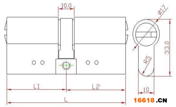 常见的锁芯,其尺寸图如下。即圆头的直径为17mm,小头部分的宽度为10mm,高度为33mm.