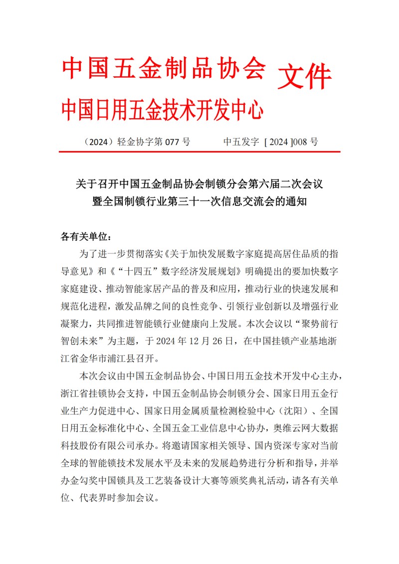 关于召开中国五金制品协会制锁分会第六届二次会议暨全国制锁行业第三十一次信息交流会的通知