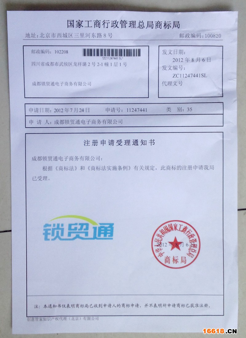 成都锁贸通电子商务有限公司注册商标“锁贸通”与2012年7月24日喜获国家工商行政总局商标局注册受理,受理号:11247441,类别:35,标志着现代锁业网开始进入品牌化、规范化运作的轨道,增强了市场竞争力,也为现代锁业网增添新的亮色。从此,现代锁业网“打造中国锁具行业第一传媒”的长远目标迈开了坚实一步。我们深信:只要我们不断进取,视服务水准为企业生存和发展的基石,“锁贸通"一定会成为中国锁具行业传媒的一线品牌,我们为此而努力。