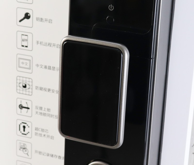 数字键盘下方为指纹识别传感器,由于指纹识别传感器设计在把手外侧,使用时只需握住把手将拇指放在指纹识别传感器处即可,非常便捷。