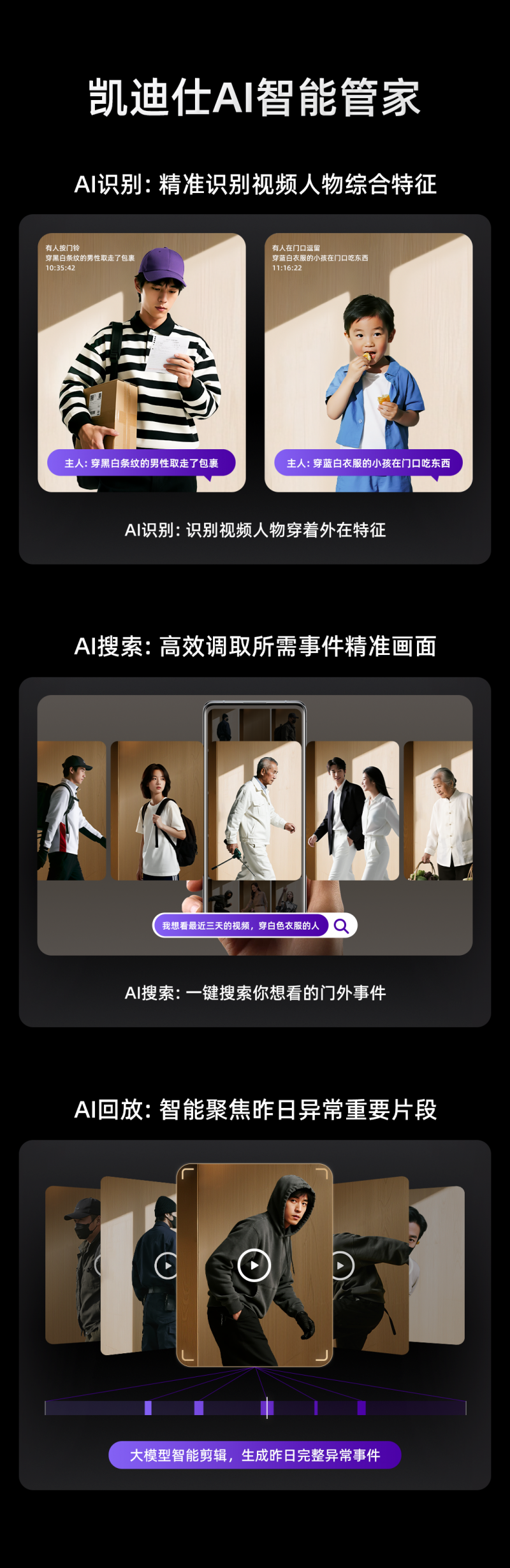 演讲重点解读了凯迪仕首创的“AI剪辑师、AI智能检索、双AI安防”技术体系——AI剪辑师可自动生成门前异常事件集锦,AI智能检索支持关键场景精准定位,双AI安防系统则通过云端大模型与本地芯片的协同实现风险预判,重构了智能锁的安防逻辑。